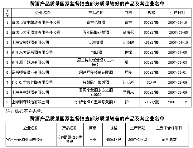 抽查結(jié)果表明:連續(xù)的國家監(jiān)督抽查促進了企業(yè)質(zhì)量意識的提高,加強了質(zhì)量管理、改進了生產(chǎn)工藝,使黃酒產(chǎn)品質(zhì)量整體水平有所提高,大中型企業(yè)的產(chǎn)品質(zhì)量繼續(xù)保持穩(wěn)定。但是部分小型企業(yè)產(chǎn)品質(zhì)量存在問題較多。