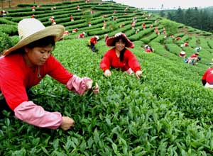茶農(nóng)在由臺商林圣光夫婦投資的茶園中采摘春茶。 |
