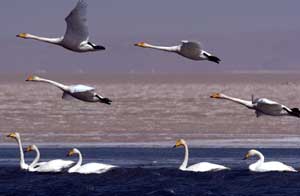 大天鵝棲息青海湖。攝影/本報記者
