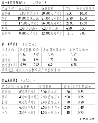 “您來得真巧,剛過立秋,這兩天豬肉便宜多了!8月13日,在北京市大洋路農(nóng)產(chǎn)品批發(fā)市場,《市場報》記者連續(xù)詢問了多家攤位豬肉的售價后發(fā)現(xiàn),所謂“便宜多了”的豬肉,后臀尖的最低售價為20元/公斤。相對于“貼秋膘”時,28元/公斤的最高價,現(xiàn)在的價格確實(shí)有所回落,但即便是現(xiàn)在的價格,不少消費(fèi)者都大呼“吃不起豬肉了”。 連續(xù)走訪北京新發(fā)地、大鐘寺、八里橋等多家農(nóng)產(chǎn)品批發(fā)市場后,記者發(fā)現(xiàn)白條豬、牛肉、羊肉、白條雞等都漲幅較大(見表一)。 從表一中不難看出,與去年相比,豬肉價格的漲勢最猛,漲幅高達(dá)100%;而受其影響,肉蛋禽等產(chǎn)品均存在大幅度上漲。牛肉均價漲幅為32%,羊肉上漲41%,雞蛋上漲21%,雞肉上漲21.8%!妒袌鰣蟆酚浾卟稍L發(fā)現(xiàn),購買豬肉的消費(fèi)者數(shù)量有所下降,而海鮮類產(chǎn)品的人氣不斷上漲。相對于一路