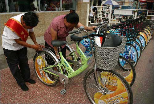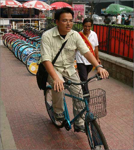 8月20日,一名記者在租車點采訪時試騎出租的自行車。新華社發(fā)(卓恩森 攝) |