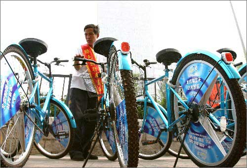 8月20日,在北京地鐵大望路租車點,一名工作人員在整理出租的自行車。為了進一步減少汽車尾氣對大氣的污染,北京市提倡市民騎自行車出行,啟動了公共單車推廣活動。目前已在城區(qū)數(shù)十個自行車出租點投放了5000輛自行車。奧運會前,自行車出租點將增至200個,將有5萬輛自行車供出租。