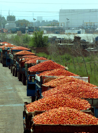 成批的優(yōu)質(zhì)西紅柿運(yùn)進(jìn)工廠加工番茄醬。 本報(bào)記者:趙戈