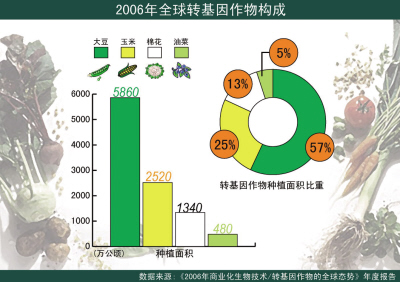 2006年全球轉(zhuǎn)基因作物的種植面積由1996年的170萬公頃發(fā)展到1.02億公頃,增長了60多倍,種植的國家達22個,還有29個國家批準轉(zhuǎn)基因作物作為食品或飼料進口,種植的農(nóng)戶首次超過1000萬,90%的受益者是發(fā)展中國家的貧困農(nóng)民。最可喜的是,因種植轉(zhuǎn)基因作物10年間累計減少使用殺蟲劑