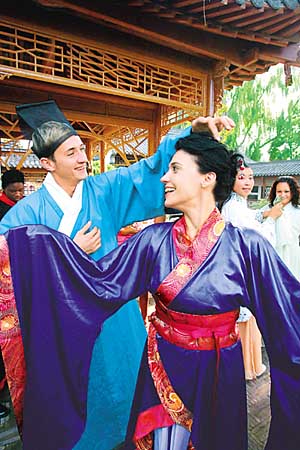[左圖] 來(lái)自烏克蘭的留學(xué)生阿里克斯(左)和丹尼婭(右)試穿中國(guó)漢服。
