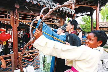來(lái)自烏克蘭的留學(xué)生阿里克斯(左)和來(lái)自津巴布韋的安德莉(右)在體驗(yàn)中國(guó)傳統(tǒng)的射禮。
