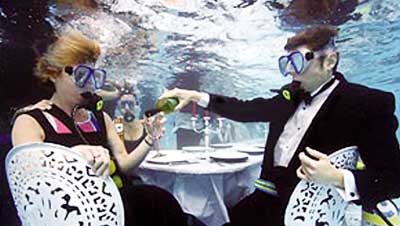 參加者在西倫敦阿克頓一個(gè)泳池內(nèi)享用免費(fèi)午餐。他們都盛裝赴會(huì),在水底四英尺的地方,坐在餐桌旁,一邊借助水中呼吸器呼吸,一邊用膳。