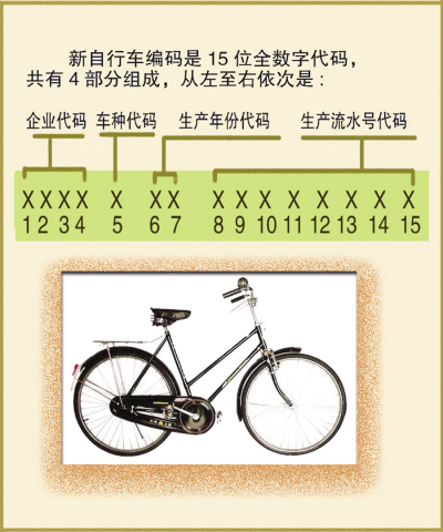 新自行車刻制編碼的工作由生產(chǎn)企業(yè)負(fù)責(zé)在自行車出廠前完成。每輛新自行車的編碼采用的是15位全數(shù)字代碼結(jié)構(gòu),共有4部分組成,從左至右依次是企業(yè)代碼、車種代碼、生產(chǎn)年份代碼、生產(chǎn)流水號(hào)代碼(如左圖所示)。 自行車的編碼應(yīng)刻制在自行車車架前管的右側(cè)、自行車中接頭的底部或者不影響自行車強(qiáng)度,且易于觀察和讀取的其他部位。編碼可以排成一行,也可以排成兩行。如果排成兩行,前7位必須排在一行,后8位排在第二行。編碼的方向應(yīng)與前管或中接頭的中心線平行或垂直。編碼可以多處同時(shí)標(biāo)注編碼。編碼刻制的字體高度應(yīng)大于4mm。要求刻制后,編碼要清晰可見,易于觀察和便于直接讀取,并采取加涂保護(hù)層等必要的保護(hù)措施,以防編碼腐蝕生銹。