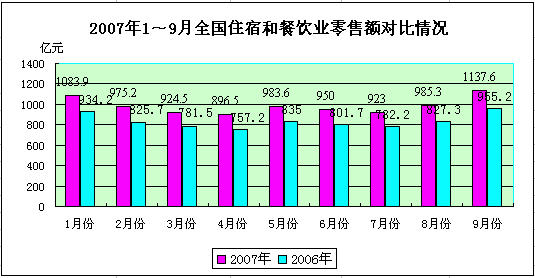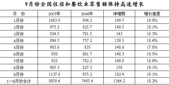 今年前三季度,我國住宿和餐飲行業(yè)實現(xiàn)較好較快發(fā)展,餐飲消費再創(chuàng)佳績。據(jù)有關(guān)數(shù)據(jù)分析,1-9月份全國住宿與餐飲業(yè)零售額累計8859.6億元,同比凈增1364.2億元,增長18.2%,增幅比去年同期高出3.3個百分點,比社會消費品零售總額增長高出2.3個百分點,占社會消費品零售總額的比重為13.9%,對社會消費品零售總額的增長貢獻率為15.6%。 從限額分類看,1-9月份,限額以上住宿與餐飲企業(yè)增速領(lǐng)先,零售額占全國住宿與餐飲業(yè)零售額的29.7%,同比增長18.9%,高于同期全國住宿與餐飲業(yè)零售額增幅0.7個百分點,拉動全國住宿與餐飲業(yè)零售額增長5.6個百分點。限額以下住宿與餐飲企業(yè)穩(wěn)中有升,零售額占全國住宿與餐飲業(yè)零售額的70.3%,同比增長17.9%,低于同期全國住宿與餐飲業(yè)零售額增幅0.3個百分點,拉動全國住宿與餐飲業(yè)零售額增長12.6個百分點。 利用外資增速趨緩。1-9月份,住宿與餐飲業(yè)新設(shè)立外商投資企業(yè)數(shù)量進一步減少,為683家,同比下降15.1%;合同外資金額24.23億美元,同比增長13.6%;實際使用外資金額6億美元,同比增長8.6%,但增幅比去年同期有所減緩。 隨著全國餐飲消費安全專項整治活動的深入開展,住宿和餐飲市場將進一步規(guī)范,食品安全進一步加強,服務(wù)質(zhì)量進一步提升,預(yù)測第四季度大眾化餐飲消費將繼續(xù)擴大,集團餐飲消費將更加集中,預(yù)計全年住宿和餐飲業(yè)零售額將達到12270億元,同比增長18.6%。