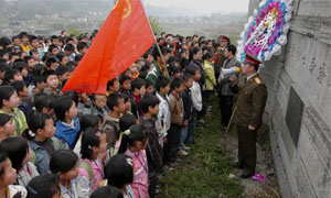 4月5日,在貴州省遵義縣南白鎮(zhèn)后壩紅軍烈士墓,遵義縣人武部政委朱松山(右)正在給后壩長征希望學(xué)校的學(xué)生講述紅軍長征的故事。 新華社記者