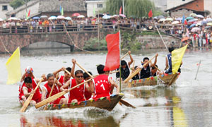6月19日,農(nóng)民代表隊激烈角逐。當(dāng)日,在浙江省蘭溪市赤溪街道楊塘楊大湖,附近九個村莊的農(nóng)民進(jìn)行端午龍船賽! 。ū緢筚Y料照片)
