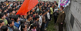 遵義縣人武部政委朱松山(右)正在給后壩長征希望學(xué)校的學(xué)生講述紅軍長征的故事。 |