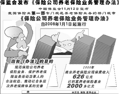 如何使咱們退休后生活水平不下降?買點(diǎn)商業(yè)養(yǎng)老保險(xiǎn),是很好的選擇之一。然而,目前商業(yè)養(yǎng)老保險(xiǎn)還處于發(fā)展的初級(jí)階段,存在著整體規(guī)模小、專業(yè)化程度低、外部經(jīng)營環(huán)境還有待改善等問題。為解決這些問題,保監(jiān)會(huì)日前發(fā)布了《保險(xiǎn)公司養(yǎng)老保險(xiǎn)業(yè)務(wù)管理辦法》(下稱《辦法》),該《辦法》將于2008年1月1日起實(shí)施。