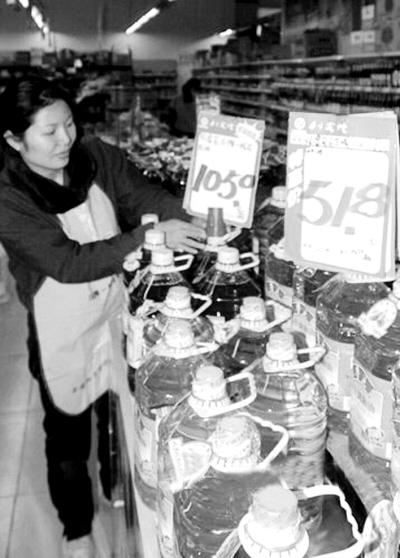 12月8日,家樂福北京方圓店。 已經(jīng)大半年沒有買過食用油的陳先生一次性購買了兩桶5.4升裝魯花1級壓榨花生油。當時,該花生油售價為105.9元。而在數(shù)周前,這個價格還是99.9元!皟r格還會漲的!奔覙犯S皖愗浖艿拇黉N員說。 花生油僅僅是個縮影。據(jù)國家有關(guān)部門價格監(jiān)測顯示,在11月份的上半月內(nèi),國內(nèi)市場食用油價格呈現(xiàn)全面上漲之勢。其中,全國花生油平均零售價格為每升