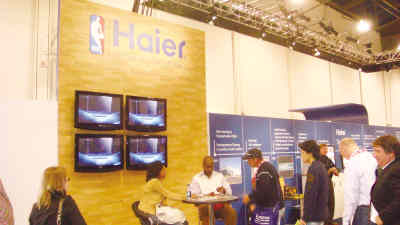 圖為NBA球星加里·佩頓在海爾彩電展臺(tái)助陣 | 1月8日在美國拉斯維加斯開幕的2008國際消費(fèi)電子展(CES)上,海爾彩電與三星、夏普等世界一流品牌比肩而立。這一跡象意味著,中國彩電的全球化策略正在漸顯成效。 許多市場分析家認(rèn)為:中國產(chǎn)品攻占了不少低端消費(fèi)市場,但欲與國際知名品牌分庭抗禮還為時(shí)尚早。而海爾彩電的行動(dòng)證明,經(jīng)過10年全球化拓展,中國彩電品牌已經(jīng)取得了世界的承認(rèn),其產(chǎn)業(yè)位置已經(jīng)置于“世界的中央”。