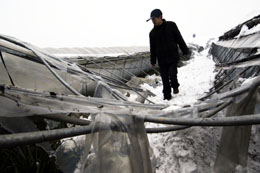 1月22日,安徽省舒城縣雙豐農(nóng)業(yè)科技示范園的工人在整理被大雪壓塌的大棚。連日來,安徽部分地區(qū)持續(xù)降雪。大雪造成全省12個(gè)市受災(zāi),受災(zāi)人口300多萬人,轉(zhuǎn)移安置4000多人,因?yàn)?zāi)死亡1人,因?yàn)?zāi)傷病14人。農(nóng)作物受災(zāi)面積200多萬畝,倒塌房屋3600多間,直接經(jīng)濟(jì)損失4.3億元。新華社記者:李健 攝