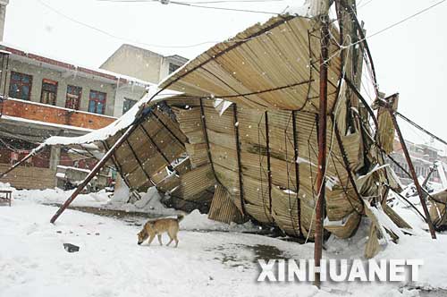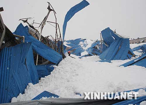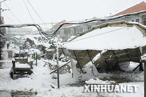 1月26日拍攝的巢湖市蘇灣鎮(zhèn)被大雪壓塌的農(nóng)貿(mào)市場(chǎng)。新華社發(fā) |