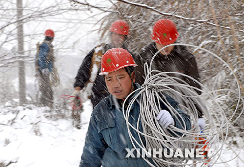 1月28日,宣城供電公司水東供電所員工冒著大雪搶修線路。 新華社發(fā)(李曉紅