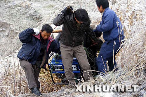 1月27日,在遭受冰災(zāi)而停電的貴州省黔南布依族苗族自治州龍里縣災(zāi)區(qū),搶險(xiǎn)人員正在為機(jī)站運(yùn)送發(fā)電機(jī)。