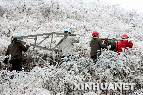 1月22日,凱里市供電部門職工趕往事故現(xiàn)場(chǎng)搶修供電設(shè)施。受大面積冰凍災(zāi)害天氣影響,貴州電網(wǎng)多處線路受損,黔東南苗族侗族自治州和銅仁地區(qū)有9個(gè)縣停止供電。凱里電網(wǎng)2000多名職工投入“抗冰保電”一線晝夜搶修。