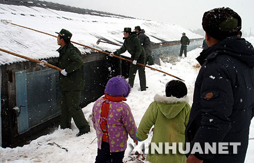 1月28日,在安徽省宣城市楊柳鎮(zhèn)華山村,武警官兵幫助村民清除積雪。當(dāng)日,安徽省宣城市普降暴雪,宣城市楊柳鎮(zhèn)華山村一養(yǎng)殖戶飼養(yǎng)的2萬(wàn)只雞被困在房屋里,武警宣城支隊(duì)官兵聞?dòng)嵹s往現(xiàn)場(chǎng),幫助當(dāng)?shù)厝罕娗謇矸e雪、搶救財(cái)產(chǎn)。新華社發(fā)(廖福安