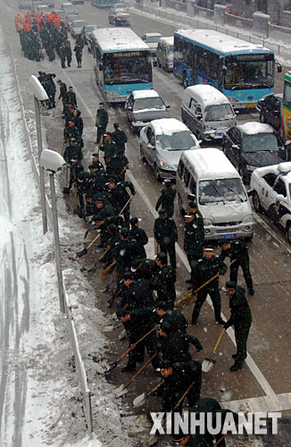 1月27日,武警安徽總隊(duì)合肥支隊(duì)的官兵在街道上除雪。當(dāng)日,合肥再次降大到暴雪,造成市內(nèi)道路積雪嚴(yán)重,交通受阻。為保障道路暢通和市民出行安全,合肥市各部門積極行動(dòng),武警安徽總隊(duì)合肥支隊(duì)也派出上千名官兵,同心同力,抗擊雪災(zāi)。