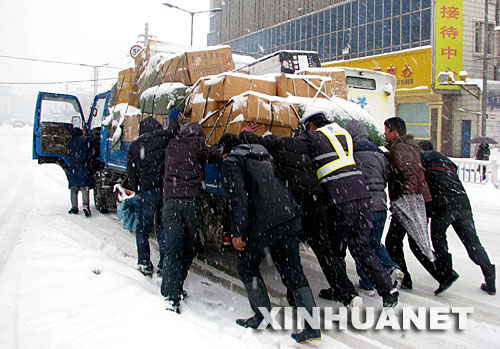 1月27日,市民和交警一起幫助推一輛拋錨的貨車。當(dāng)日,安徽省蕪湖市出現(xiàn)暴雪天氣,當(dāng)?shù)仄囌究瓦\(yùn)全線停運(yùn)。蕪(湖)馬(鞍山)、蕪(湖)宣(城)高速公路全部封閉,安徽氣象部門同時(shí)發(fā)布暴雪橙色預(yù)警和道路結(jié)冰黃色預(yù)警。新華社發(fā) |