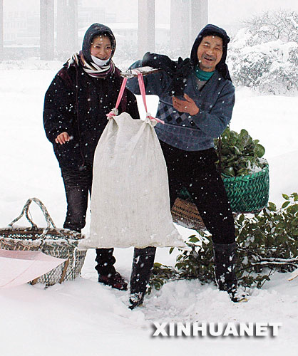 1月28日,菜農(nóng)冒雪送菜到菜市。從1月26日起,安徽省蕪湖市連降大雪,道路交通受阻,菜市蔬菜供應(yīng)緊缺。不少菜農(nóng)冒雪送菜。新華社發(fā)(陳立希