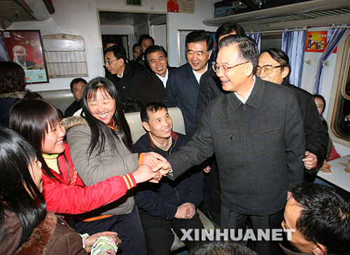 1月30日,中共中央政治局常委、國(guó)務(wù)院總理溫家寶在廣州火車站看望旅客。這是溫家寶總理登上一列即將發(fā)往南昌的火車與旅客交談。