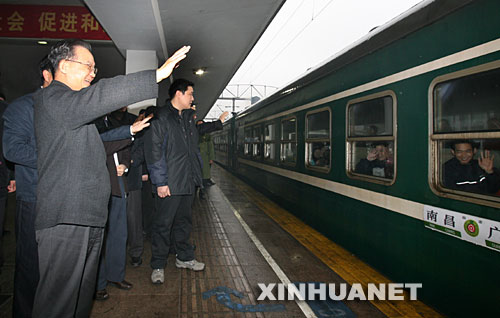 這是溫家寶總理在站臺(tái)上為一列發(fā)往南昌的旅客列車送行。