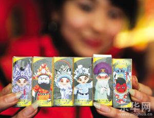 昨天(13日),在北京一家專營火柴盒的小鋪內(nèi),一女孩展示印有京劇臉譜卡通圖案的火柴盒。