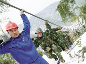 國(guó)務(wù)院煤電油運(yùn)和搶險(xiǎn)抗災(zāi)應(yīng)急指揮中心昨日介紹,鐵路部門繼續(xù)加大電煤運(yùn)輸力度,直供電廠存煤量持續(xù)回升。 13日,鐵路運(yùn)輸電煤42128車,超調(diào)整計(jì)劃2128車,同比多裝14128車,多運(yùn)近100萬(wàn)噸。12日,直供電廠存煤2425萬(wàn)噸,比前一日增加56萬(wàn)噸,可用天數(shù)達(dá)12天;庫(kù)存低于3天的電廠25個(gè),比前一日增加4個(gè)。目前全國(guó)鐵路、公路、民航、航運(yùn)交通運(yùn)輸情況正常,春運(yùn)秩序平穩(wěn)。截至昨日,國(guó)家電網(wǎng)公司系統(tǒng)已有93.6%的停電用戶恢復(fù)供電;災(zāi)區(qū)主要市場(chǎng)糧油價(jià)格繼續(xù)保持穩(wěn)定,全國(guó)肉蛋菜價(jià)格比前一日普遍下跌。圖為解放軍官兵和電力工人在湖北省通山縣太平山搶修電網(wǎng)。 | |