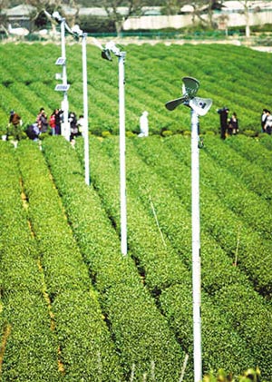 2月29日,浙江杭州梅家塢一塊龍井茶園里安裝了8臺(tái)風(fēng)扇,當(dāng)溫度低于4攝氏度時(shí),風(fēng)扇會(huì)自動(dòng)開啟,利用加快冷暖空氣對(duì)流的方式來減少霜凍對(duì)茶葉的影響。