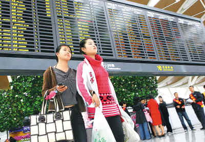 3月26日,上海浦東國際機(jī)場(chǎng)2號(hào)航站樓和第三跑道正式投入運(yùn)營,標(biāo)志著歷時(shí)近3年建設(shè)的浦東機(jī)場(chǎng)擴(kuò)建工程全面建成啟用。浦東機(jī)場(chǎng)擴(kuò)建工程建成后將使年旅客吞吐量達(dá)到6000萬人次,可有效滿足北京奧運(yùn)會(huì)和2010年上海世博會(huì)期間航空運(yùn)輸量高峰的需要。圖為3月26日,浦東國際機(jī)場(chǎng)新航站樓迎來首批旅客。 | |