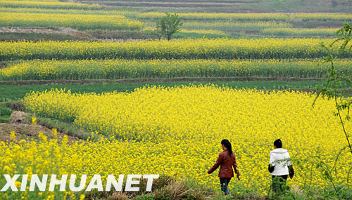 4月1日,在湖北省京山縣孫橋鎮(zhèn),兩位村民在油菜花盛開的田間行走。