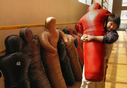 3月27日,一名國家武術(shù)散打隊(duì)女隊(duì)員扛著人形沙袋準(zhǔn)備上場地訓(xùn)練摔技。 經(jīng)國際奧委會(huì)同意,在北京奧運(yùn)會(huì)期間將同時(shí)舉行“北京2008武術(shù)比賽”。為做好備戰(zhàn)工作,國家武術(shù)運(yùn)動(dòng)管理中心在年初組建了國家武術(shù)散打隊(duì),16名男女選手都是獲得世界、全國冠軍的散打高手。目前,他們正在陜西省體育訓(xùn)練中心緊張訓(xùn)練,力爭在北京奧運(yùn)會(huì)期間,向世界各國人民展現(xiàn)中國武術(shù)的精華和魅力。 |