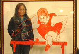 “中國人的驕傲”剪紙藝術(shù)巡展首站在香港中央圖書館啟動(dòng),展出近200幅以奧運(yùn)為主題的剪紙作品。圖為“中國人的驕傲——永恒瞬間”創(chuàng)作人盧雪和她的作品《劉翔》合影。