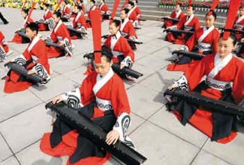 4月9日,首屆中國鄭州炎黃文化周在鄭州黃河風(fēng)景名勝區(qū)炎黃廣場開幕。此活動以“萬龍歸宗、祈福中華”為主題,弘揚中華優(yōu)秀傳統(tǒng)文化。圖為演員在開幕儀式上彈奏古琴。