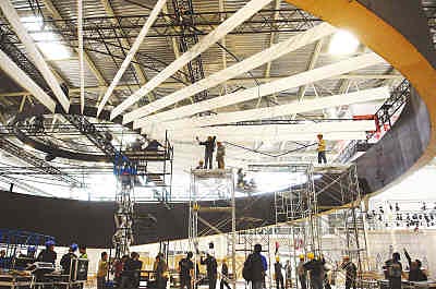 2008(第十屆)北京國(guó)際汽車展覽會(huì)將于4月22日在北京中國(guó)國(guó)際展覽中心舉行。本屆車展將有225家海外廠商和1800余家國(guó)內(nèi)廠商參展。圖為14日北京新國(guó)展中心,工作人員在一巨大汽車引擎下緊張搭臺(tái)布展。