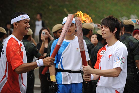 4月21日,奧運(yùn)火炬手在傳遞過(guò)程中進(jìn)行交接。新華社記者 安治平