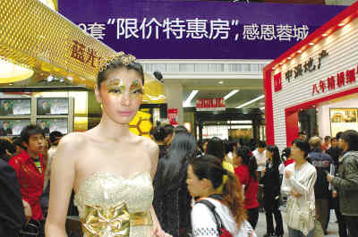 眼下,房地產(chǎn)市場受宏觀調(diào)控政策影響人氣低迷,開發(fā)商為促銷樓盤,不得不使出各種吸引眼球的“高招”。圖為在成都春季房地產(chǎn)交易會(huì)上,某樓盤聘請的職業(yè)模特。