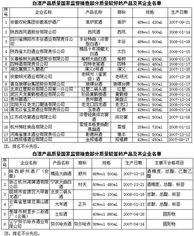 為了維護消費者的合法權益,促進白酒行業(yè)健康發(fā)展,國家質檢總局組織對白酒產(chǎn)品質量進行了國家監(jiān)督抽查。共抽查了北京、天津、河北、山西、遼寧、吉林、黑龍江、江蘇、浙江、安徽、江西、山東、河南、湖北、四川、重慶、貴州、云南、陜西等19個省、自治區(qū)、直轄市333家企業(yè)生產(chǎn)的350種產(chǎn)品(不涉及出口產(chǎn)品),產(chǎn)品實物質量抽樣合格率為90.9%。