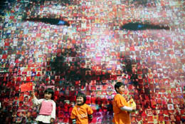 4月26日,三名小朋友在親子節(jié)活動現(xiàn)場由2008張照片組成的“奧運(yùn)寶寶笑臉”前留影。當(dāng)日,一場主題為“娃娃迎奧運(yùn)、親子圓夢想”的親子節(jié)活動在南京市玄武湖舉行,吸引眾多小朋友和家長參與。