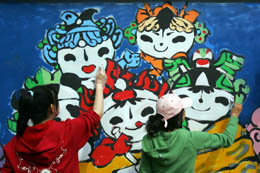 作為北京市民參與奧運(yùn)環(huán)境建設(shè)的重要標(biāo)志,北京第一面奧運(yùn)文化墻日前在北京理工大學(xué)西校墻亮相,400多名熱心市民和奧運(yùn)志愿者在約600米長的墻上創(chuàng)作,由此拉開了北京市民迎奧運(yùn)文化墻創(chuàng)意設(shè)計活動的帷幕。圖為大學(xué)生在奧運(yùn)文化墻上進(jìn)行創(chuàng)作。