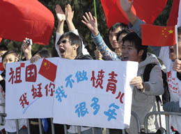 4月24日,華人華僑為奧運(yùn)圣火傳遞活動加油。當(dāng)日,北京奧運(yùn)圣火傳遞活動在澳大利亞堪培拉舉行!