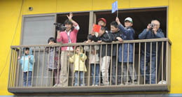 4月26日,日本民眾在陽臺上觀看火炬?zhèn)鬟f。當(dāng)日,北京奧運(yùn)會圣火傳遞活動在日本長野舉行。
