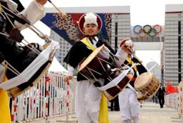 4月27日,北京奧運(yùn)圣火傳遞活動在韓國首爾舉行。這是圣火傳遞現(xiàn)場的文藝表演。