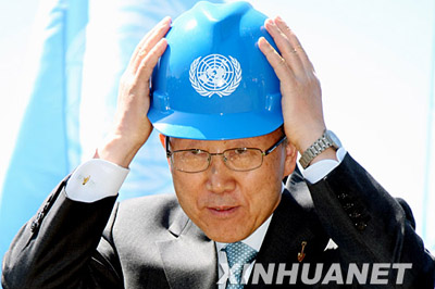 5月5日,在美國紐約聯(lián)合國總部北草坪,聯(lián)合國秘書長潘基文在奠基儀式上戴頭盔。 | |