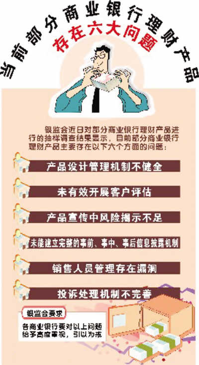 銀監(jiān)會(huì)對(duì)部分銀行理財(cái)產(chǎn)品進(jìn)行了抽樣調(diào)查,發(fā)現(xiàn)部分銀行在開(kāi)展理財(cái)業(yè)務(wù)的過(guò)程中存在較為嚴(yán)重的違規(guī)行為;核心是未嚴(yán)格且有效執(zhí)行相關(guān)法律法規(guī)和監(jiān)管規(guī)章!安糠稚虡I(yè)銀行未能按照符合客戶利益和風(fēng)險(xiǎn)承受能力的適應(yīng)性原則設(shè)計(jì)理財(cái)產(chǎn)品,沒(méi)有從資產(chǎn)配置的角度進(jìn)行產(chǎn)品開(kāi)發(fā)和投資組合設(shè)計(jì),沒(méi)有應(yīng)用科學(xué)合理的測(cè)算方法預(yù)測(cè)理財(cái)投資組合的收益率,沒(méi)有設(shè)置相應(yīng)的市場(chǎng)風(fēng)險(xiǎn)監(jiān)測(cè)指標(biāo)和有效的市場(chǎng)風(fēng)險(xiǎn)識(shí)別、計(jì)量、監(jiān)測(cè)和控制體系。” “產(chǎn)品設(shè)計(jì)管理機(jī)制不健全”是部分銀行個(gè)人理財(cái)產(chǎn)品的“第一宗罪”。同時(shí),部分商業(yè)銀行在代理銷售其他金融機(jī)構(gòu)投資產(chǎn)品過(guò)程中,沒(méi)有對(duì)所代理產(chǎn)品進(jìn)行充分分析,對(duì)產(chǎn)品提供者經(jīng)營(yíng)管理、市場(chǎng)投資和風(fēng)險(xiǎn)管理能力沒(méi)有進(jìn)行有效評(píng)估,沒(méi)有明確界定雙方權(quán)利義務(wù)和風(fēng)險(xiǎn)責(zé)任,對(duì)代理銷售產(chǎn)品的風(fēng)險(xiǎn)收益監(jiān)測(cè)數(shù)據(jù)沒(méi)有進(jìn)行必要驗(yàn)證。 其后是“未有效開(kāi)展客戶評(píng)估”。部分商業(yè)銀行沒(méi)有進(jìn)行客戶風(fēng)險(xiǎn)偏好評(píng)估工作,或評(píng)估工作流于形式;沒(méi)做到準(zhǔn)確了解客戶的財(cái)務(wù)狀況、投資目的、投資經(jīng)驗(yàn)以及風(fēng)險(xiǎn)認(rèn)知和承受能力;沒(méi)有評(píng)估客戶是否適合購(gòu)買所推介的理財(cái)產(chǎn)品,并將有關(guān)評(píng)估意見(jiàn)告知客戶。 同時(shí)“產(chǎn)品宣傳中風(fēng)險(xiǎn)揭示不足”。部分商業(yè)銀行“未能建立完整的事前、事中、事后信息披露機(jī)制”;未及時(shí)通過(guò)有效渠道和方式向客戶告知相關(guān)情況,特別是在理財(cái)產(chǎn)品存續(xù)期內(nèi),未能很好地向客戶提供方便、及時(shí)、準(zhǔn)確的資產(chǎn)變動(dòng)、期末資產(chǎn)估值等重要信息。 此外,部分商業(yè)銀行對(duì)理財(cái)產(chǎn)品銷售人員的管理存在漏洞;而且投訴處理機(jī)制不完善。主要表現(xiàn)為部分商業(yè)銀行沒(méi)有對(duì)本行理財(cái)產(chǎn)品銷售人員進(jìn)行有效管理,沒(méi)有建立相應(yīng)的個(gè)人理財(cái)業(yè)務(wù)人員資格考核與認(rèn)定、繼續(xù)培訓(xùn)、跟蹤評(píng)價(jià)等管理制度。缺乏專門的人員和部門及時(shí)處理客戶投訴,客戶投訴情況分析研究不足,對(duì)于客戶投訴較多的理財(cái)業(yè)務(wù)環(huán)節(jié)和理財(cái)產(chǎn)品不能及時(shí)有效地解決和改正。