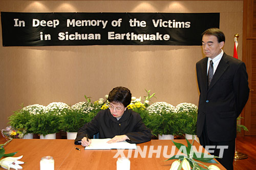 5月20日,在瑞士日內(nèi)瓦,世界衛(wèi)生組織總干事陳馮富珍前往中國常駐日內(nèi)瓦聯(lián)合國代表團(tuán)駐地,吊唁中國汶川大地震遇難者,并稱贊中國的救災(zāi)工作高效透明。